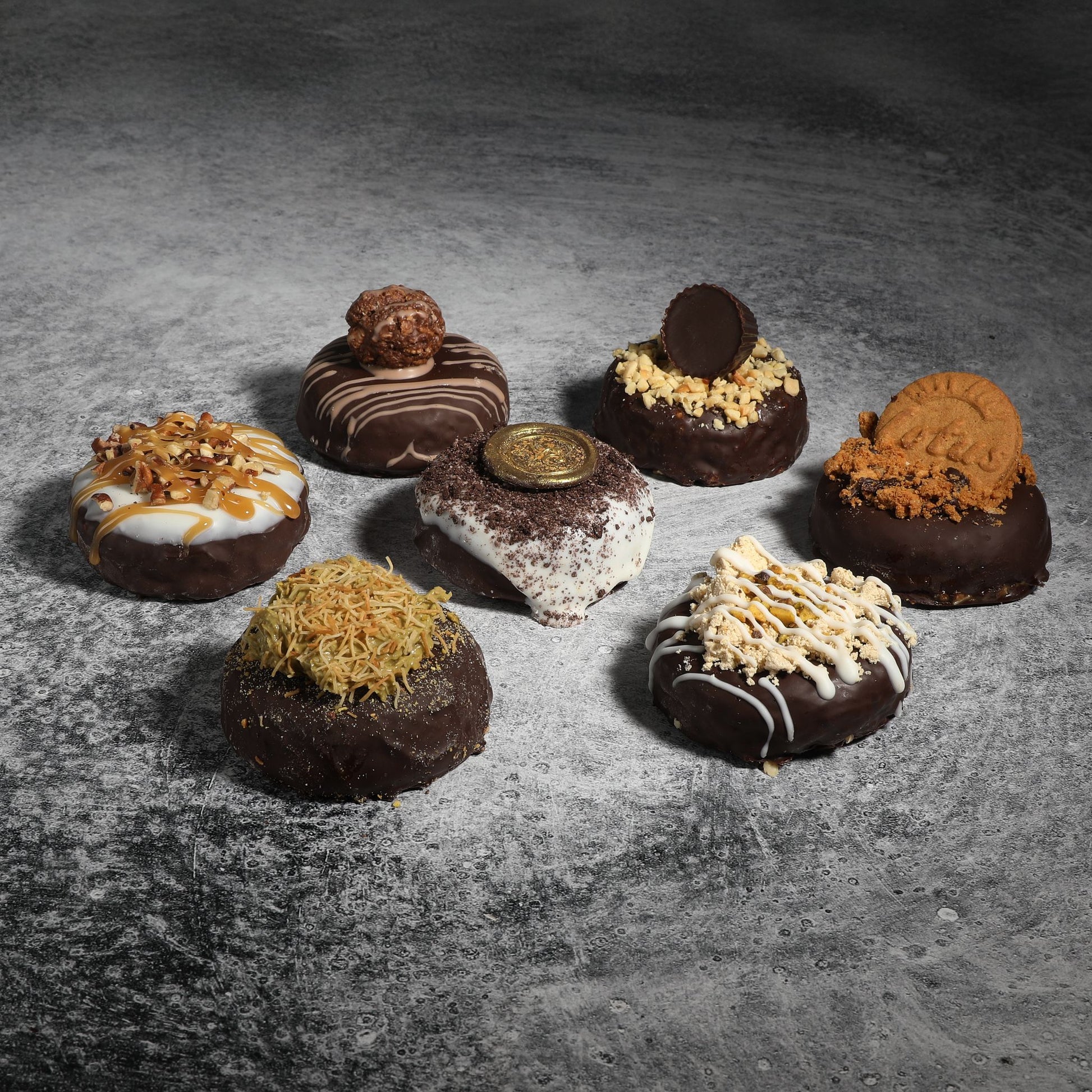 LOCAL DELIVERY OR STORE PICKUP ONLY. Indulge in our exquisite "NOT-Doughnuts"—our take on the classic doughnut. These 7 handcrafted confections feature decadent fillings, a rich chocolate coating, and artful garnishes.
