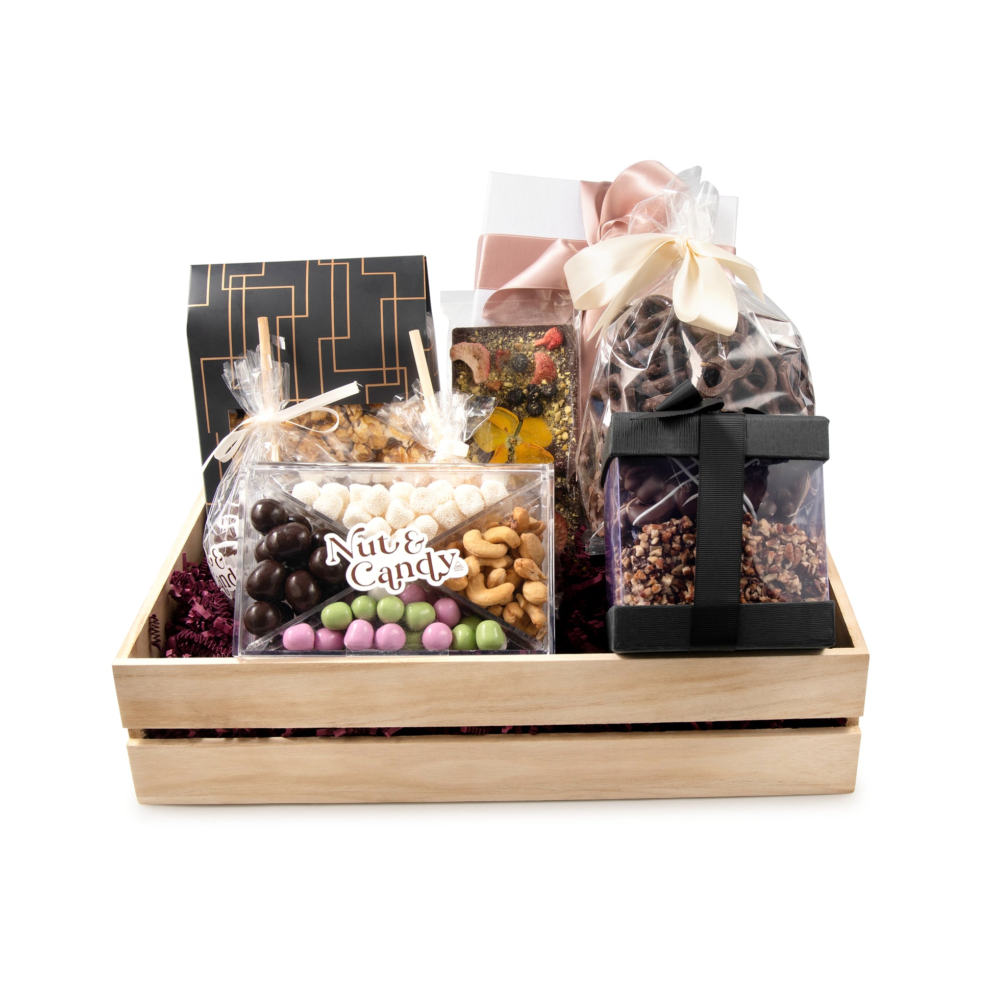 The basket also includes two specialty caramel apples hand-dipped in creamy caramel and coated with either nuts or dark chocolate, a reusable lucite box filled with cashews, Nordic mints, chocolate-covered cookie bites, and champagne bubbles, a 1lb bag of chocolate-covered pretzels, and our addictive caramel popcorn with chocolate drizzle for a sweet and salty snack.