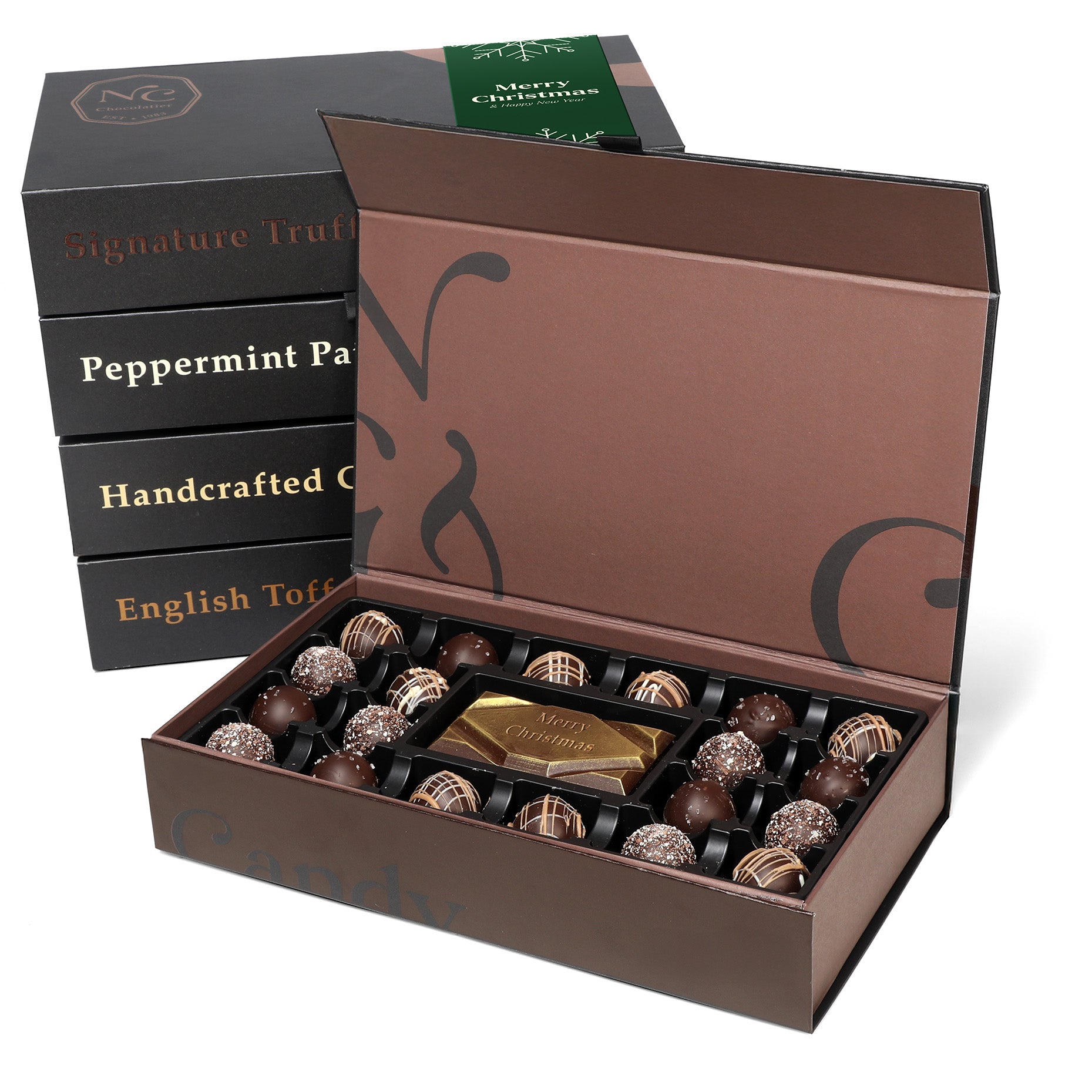 NC Chocolatier brings together the iconic tastes of some of our most popular treats with the premium presentation of our magnetic boxes. Our luxury gifts feature our refreshing peppermint patties, rich English Toffee, and assorted truffles with a customized chocolate business card. All gifting options are made with 100% Belgian chocolate, ensuring the best tasting experience.