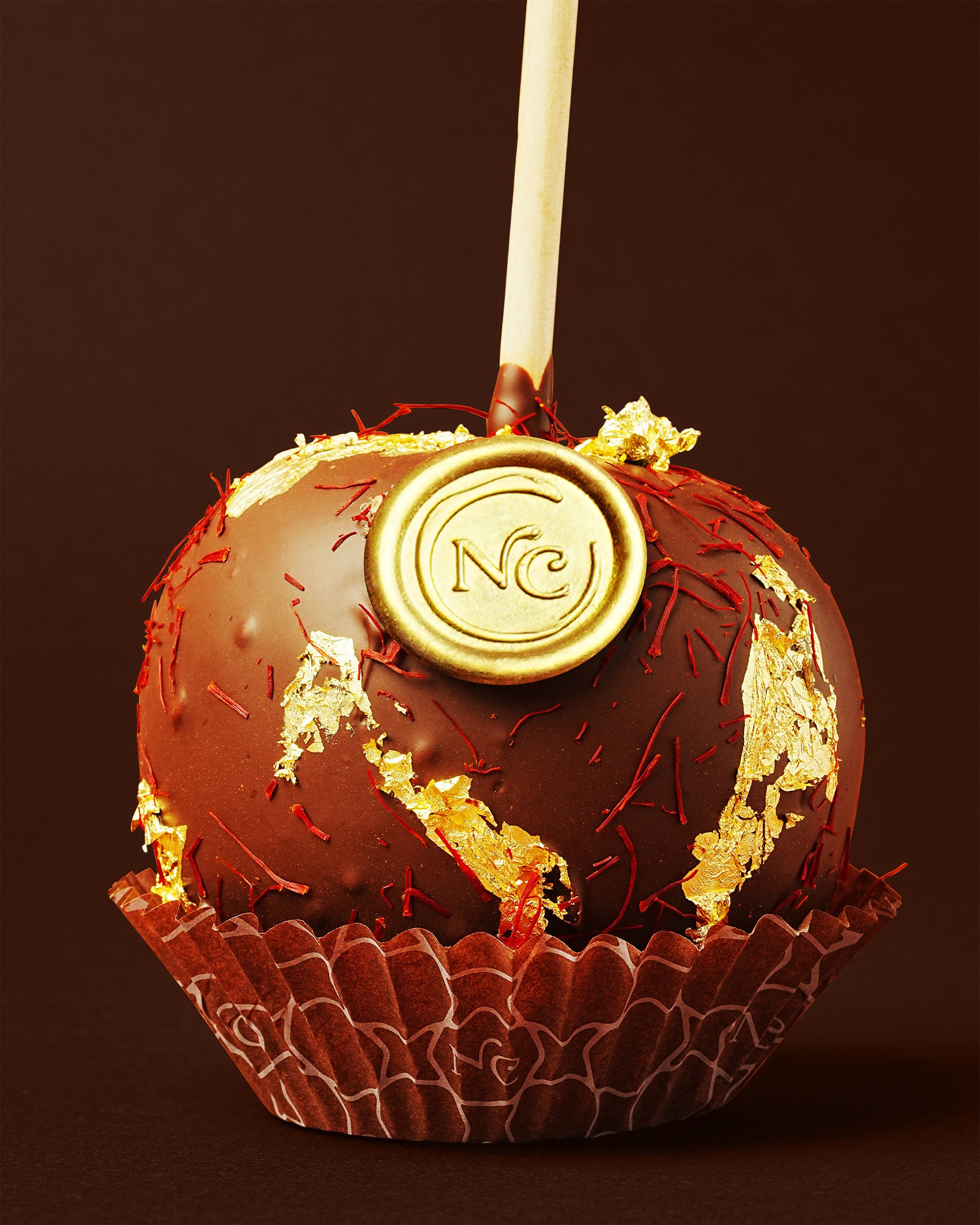 Crisp Granny Smith. Hand-dipped in slow-cooked caramel, draped in Belgian chocolate, and finished with a crown of saffron and 24k gold leaf. Floral, gilded, and unapologetically over the top. A showpiece you can bite into.