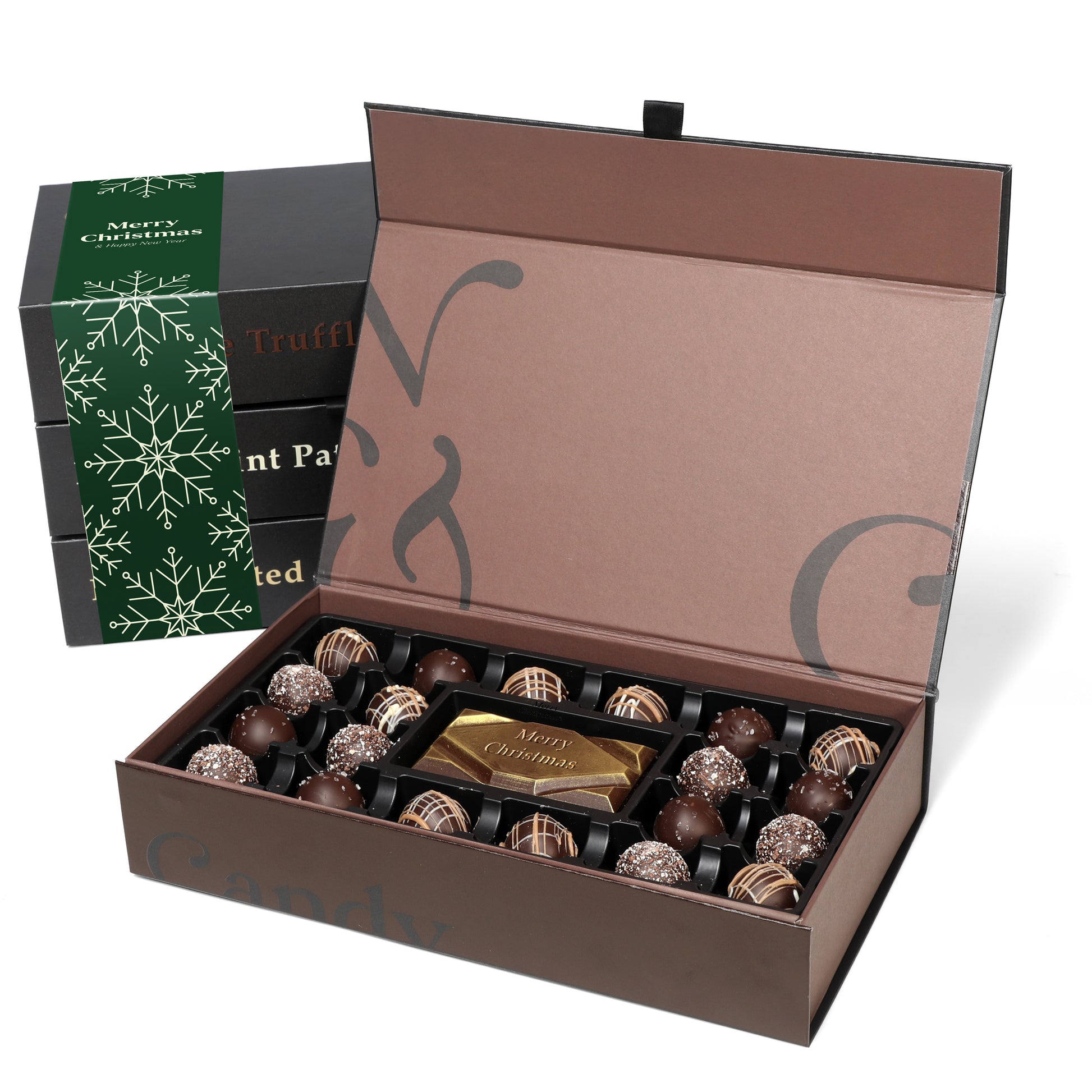 NC Chocolatier brings together the iconic tastes of some of our most popular treats with the premium presentation of our magnetic boxes. Our luxury gifts feature our refreshing peppermint patties, rich English Toffee, and assorted truffles with a customized chocolate business card. All gifting options are made with 100% Belgian chocolate, ensuring the best tasting experience.