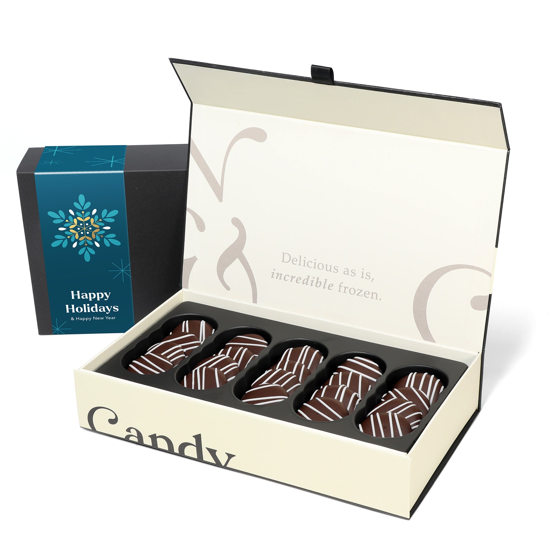 Celebrate the holidays with NC Chocolatier’s signature line of small-batch confections specially packaged with "Happy Holidays" gift bands.