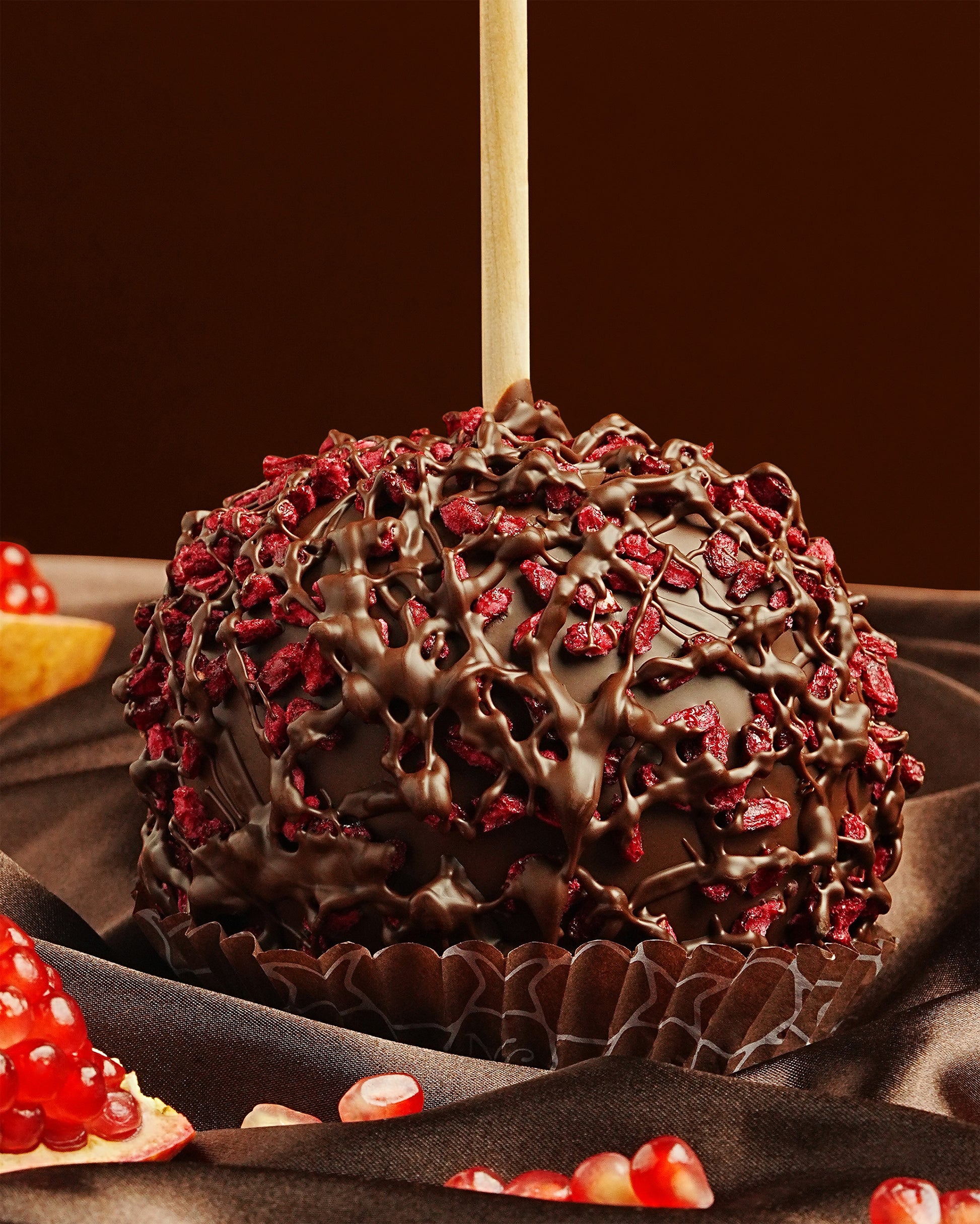 Crisp Granny Smith. Slow-cooked caramel. Dipped in Belgian dark chocolate and sprinkled with freeze-dried pomegranate seeds for a bright, jewel-toned display. Bold, bright, and ready to steal the spotlight.